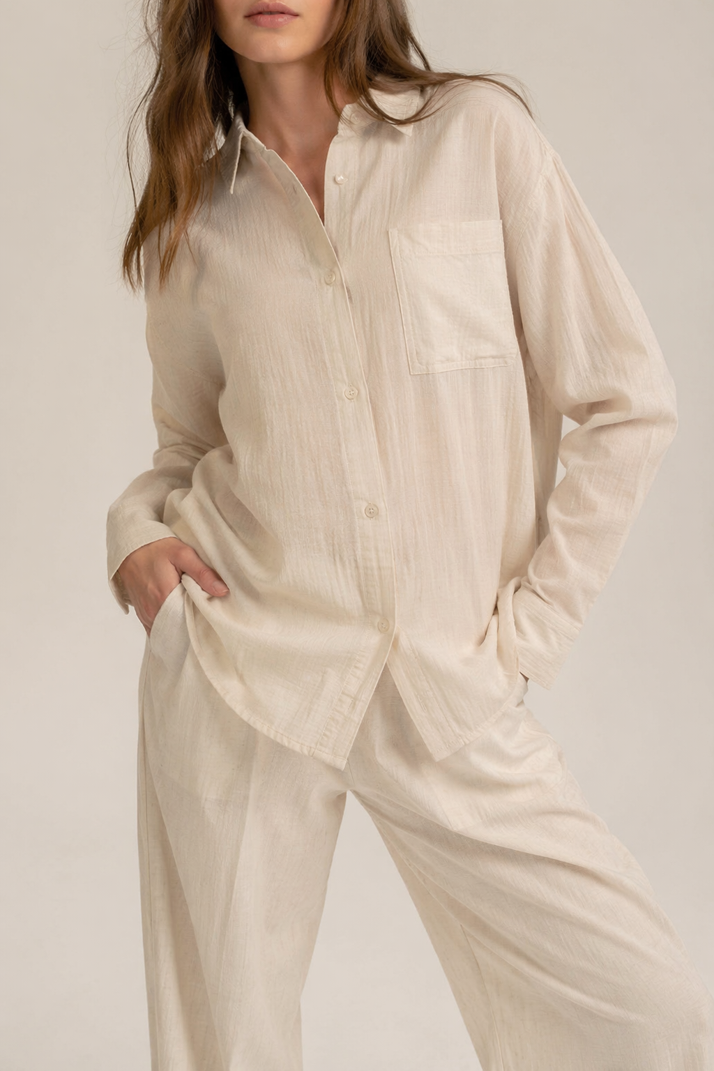 Designed for a laid-back yet polished look, this oversized cotton shirt blends structure with softness. Its relaxed silhouette offers all-day comfort while maintaining a clean, contemporary aesthetic—perfect for layering or wearing as a statement on its own.
